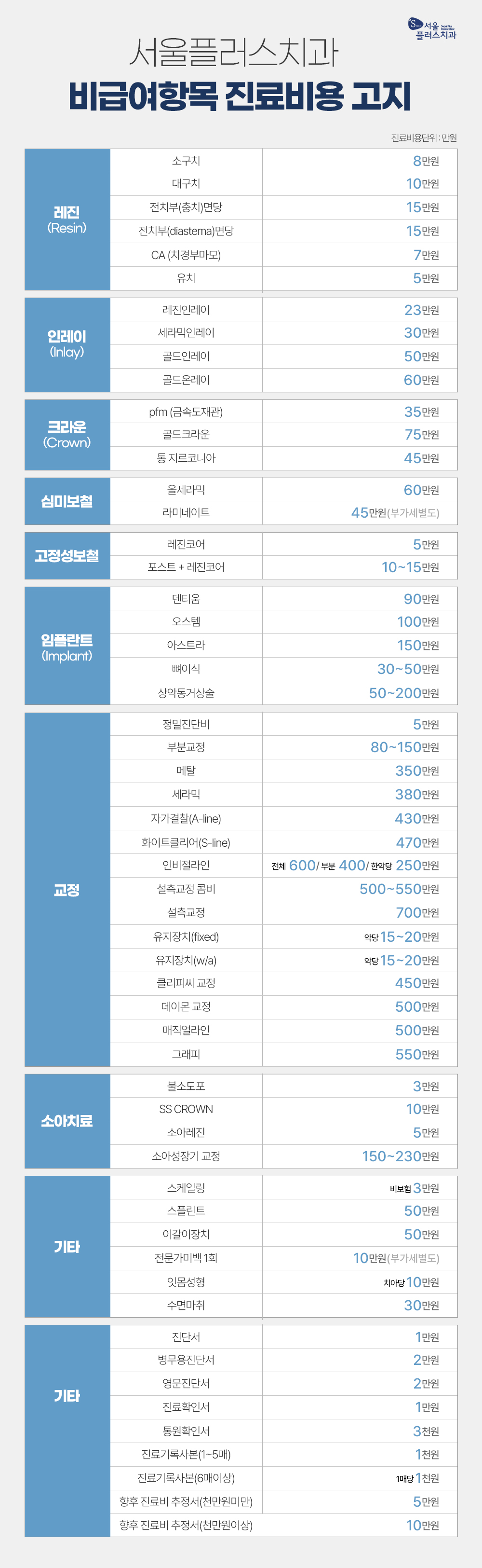 서울플러스치과 비급여항목 진료 수가표 안내